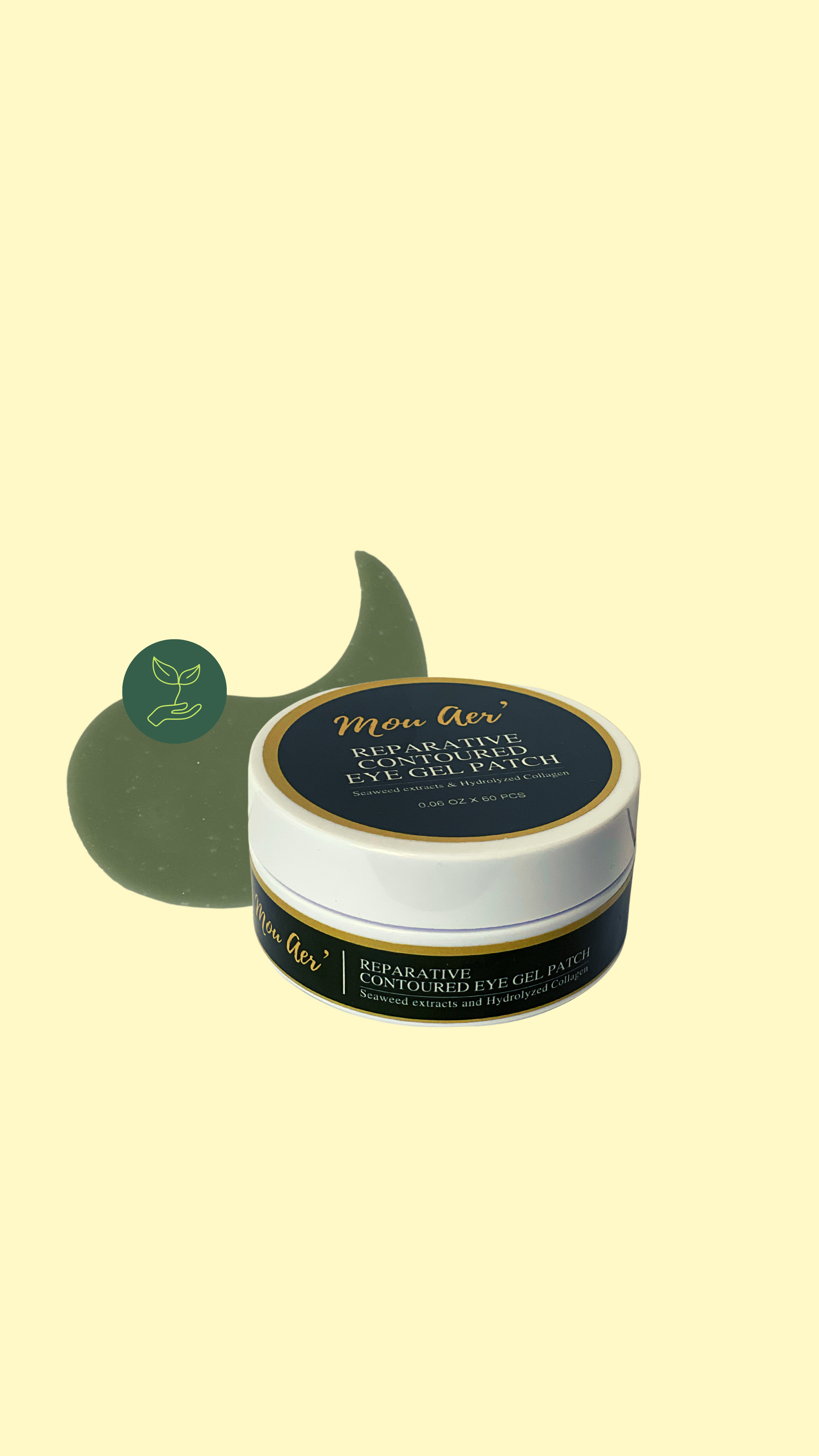 Mou Aér Reparative contoured eye gel patch is formulated from Fucus vesiculosus, a type of seaweed that promotes the contraction of fibroblast-populated collagen gels through increased expression of integrin molecules; and cosmetic-grade Carageenan extract, which has hydrating and antiviral properties. Recent results from controlled studies suggest that the combination of both extracts had synergistic anti-aging and reparative capabilities to other moisture binders such as sodium hyaluronate and hydrolyzed collagen when applied to skin.